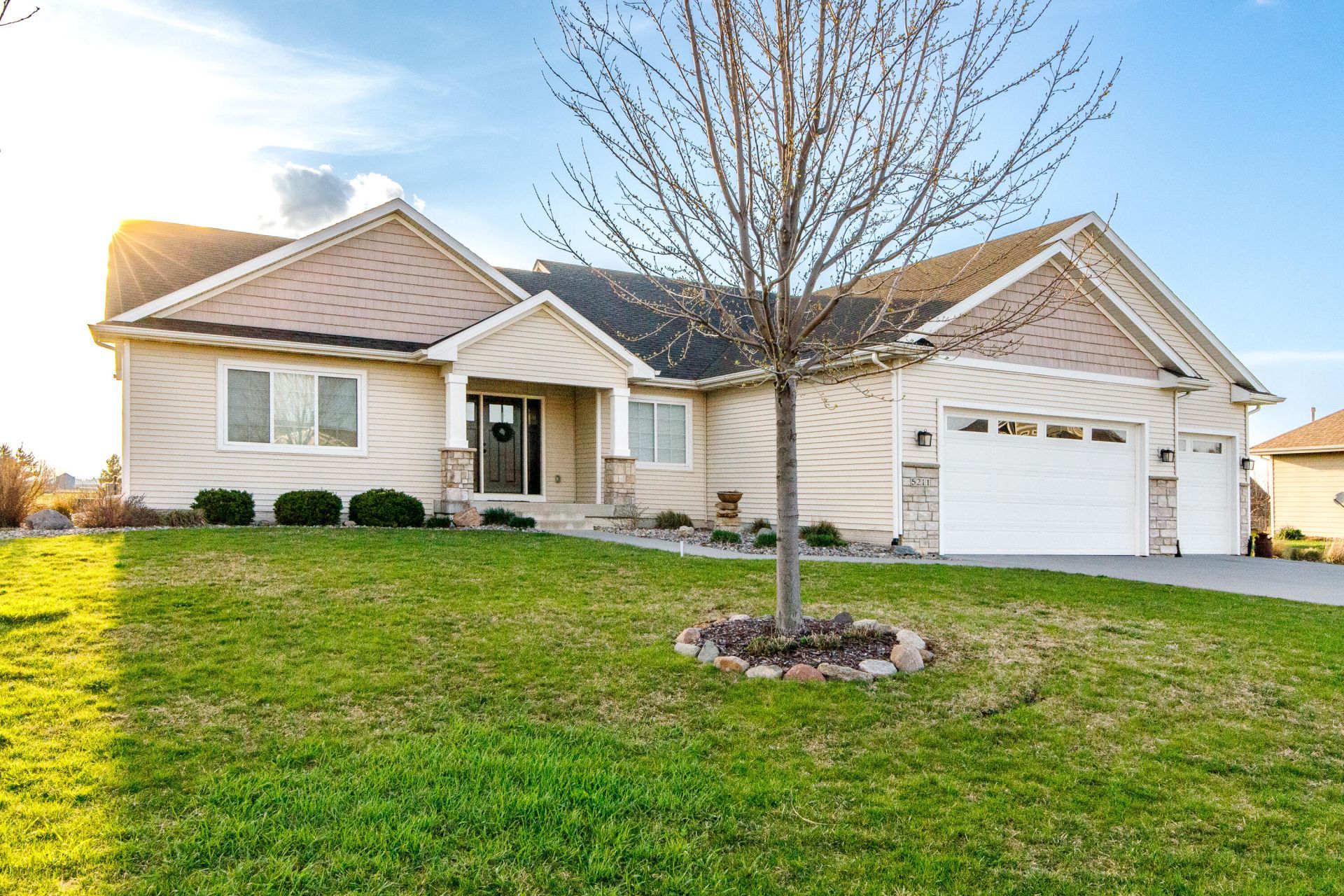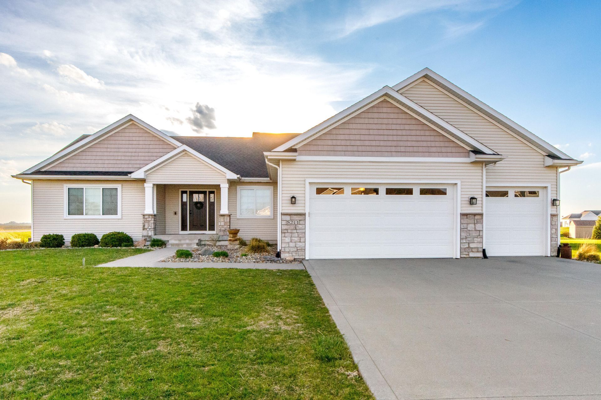 Looking for a ranch home with space, style, and incredible sunsets? Welcome to 5211 Harvest Rd in Cameron Estates.Sitting on just over an acre in the Gilbert School District, this 4-bedroom home offers nearly 3,400 finished square feet designed for comfortable everyday living and entertaining.The main level features an open layout with beautiful natural light, a cozy gas fireplace, and a stunning kitchen with quartz countertops, stainless appliances, and a large island that naturally becomes the heart of the home.Step out onto the covered deck and enjoy peaceful countryside views and breathtaking sunsets. Downstairs you'll find a spacious finished basement complete with a custom wet bar--perfect for game nights or hosting friends.With a 3-car garage, irrigation system, and room to spread out on 1.02 acres, this home offers the perfect balance of neighborhood living and open space just minutes from Downtown and ISU.
